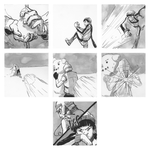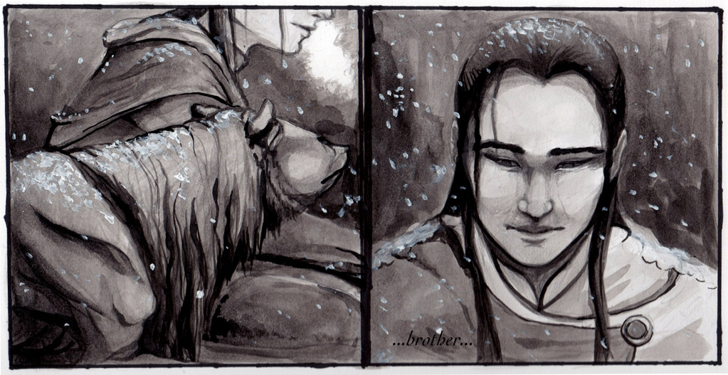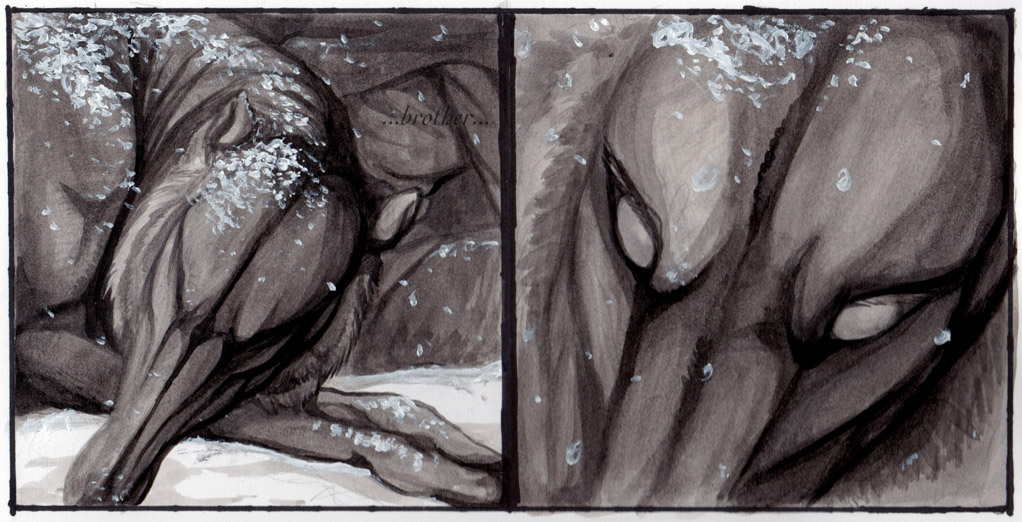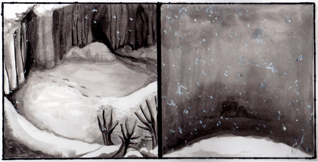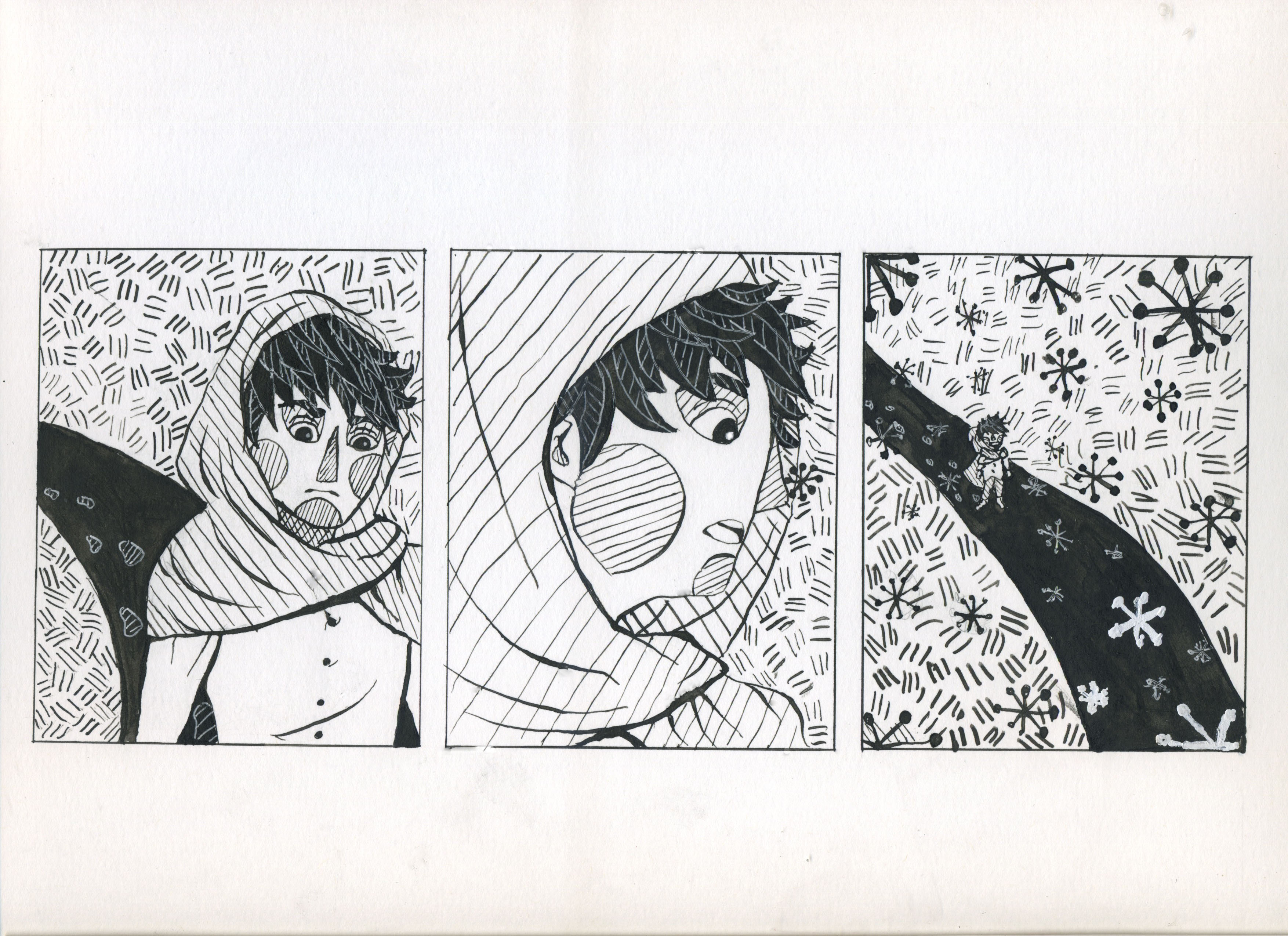 Hi all, here is my ‘Snow’ comic. I worked on this for like ten hours straight, I couldn’t stop! I thought this was a good chance to introduce you all to the main character of my book series, Avedis, and his faithful companion R’Luizia. I loved using the ink wash and the reason I decided to use Avedis in this comic is because he has a strong aversion to the cold and snow. You might be able to guess why from the comic…