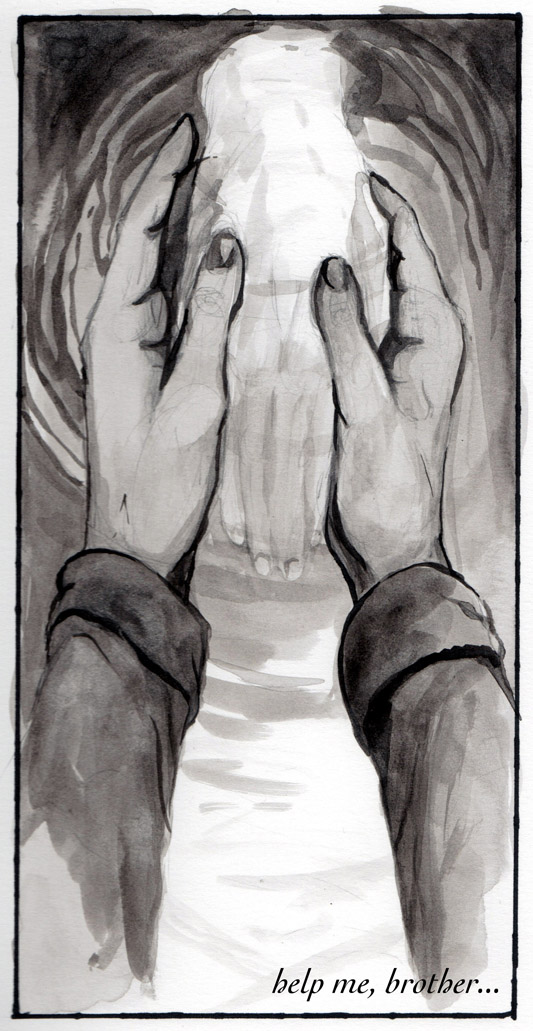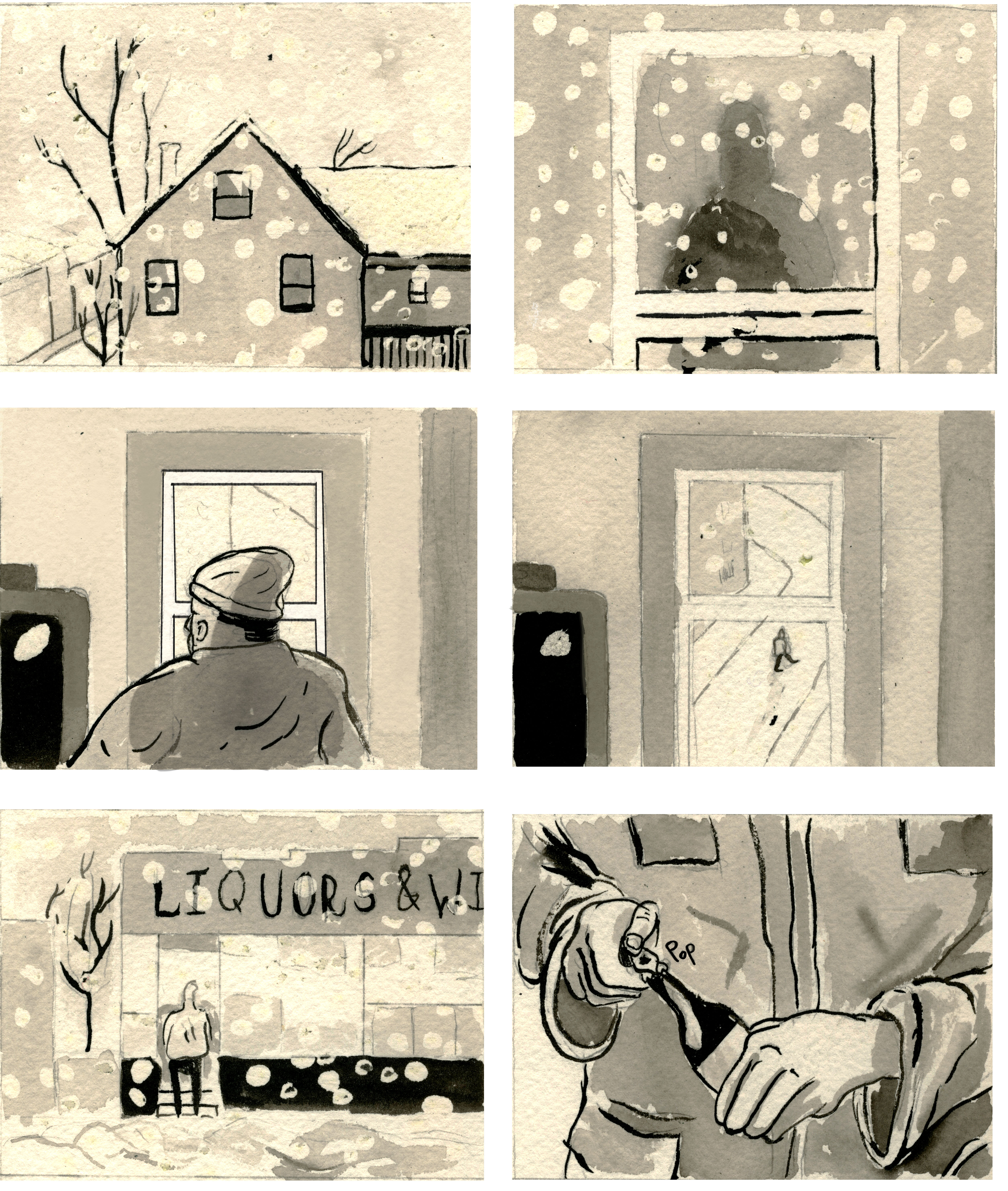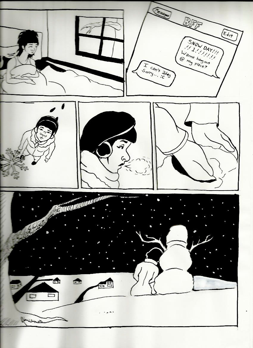 This is my snow comic for the class we missed on Tuesday. I’m sorry its all blurry and weird; my scanner and computer hate each other. Anyways, snow days always seem sort of lonely to me, so I pictured a girl making a little snowman companion to keep her company. I really wanted it to be quiet and calm, but I plan to throw in mid-tones when I can get to the art store tomorrow to buy better ink.