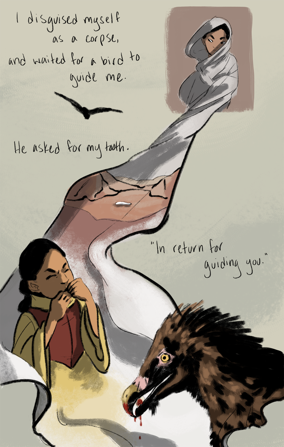 Using the fabric to lead the reader down the page was a beautiful idea. I kind of want to see more of that throughout the story! Also, great story telling.
